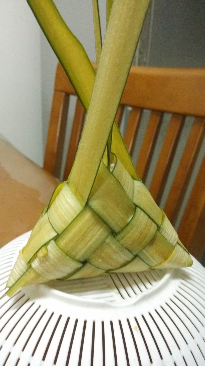 2:葵叶编制成三角形或六角形的盒子,粽子馅灌进盒子中。