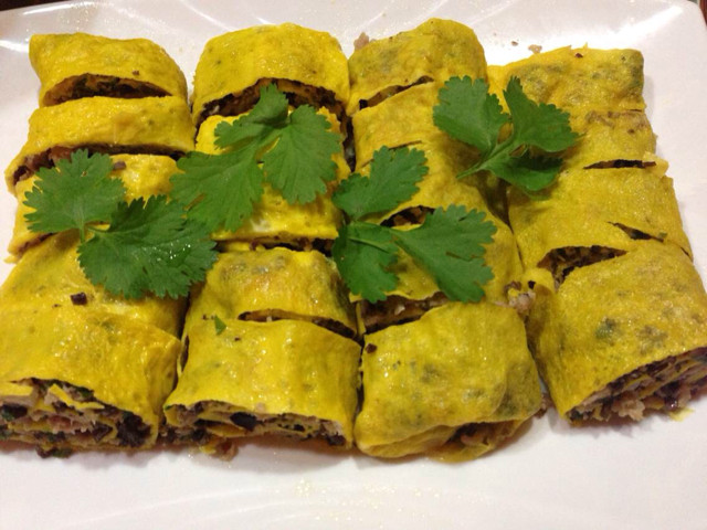 4:将馅料平铺在蛋皮上,像卷寿司一样卷好,成条装入蒸锅中蒸20分钟。取出切块装盘。香气四溢,很好下饭。