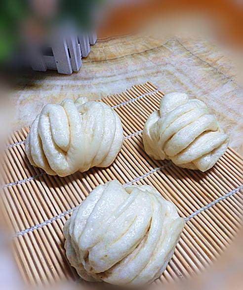 12:切面重叠,两手捏住两端,拉长。两手相反方向拧一下,在底部集合并捏紧,即成花卷生胚。