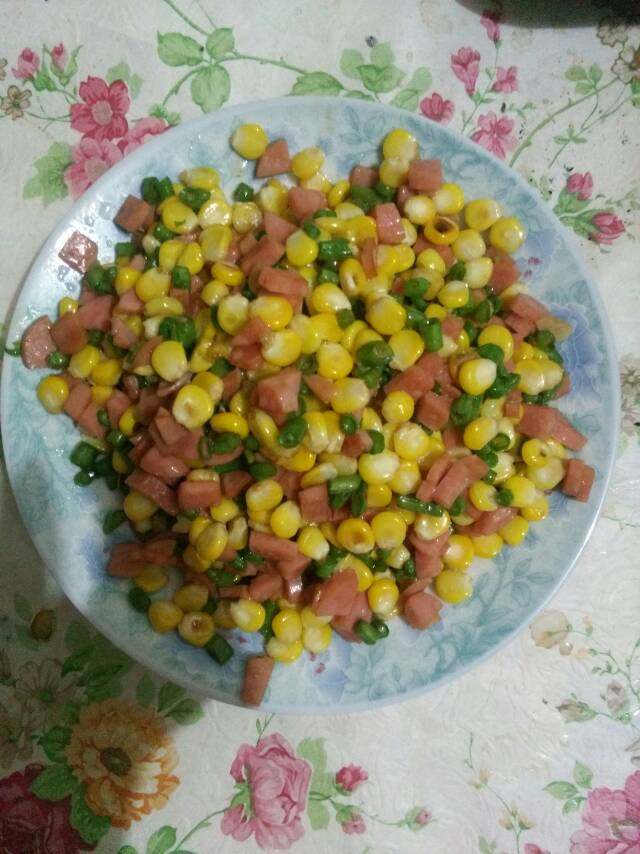 2:将玉米用手扣或用刀切一粒粒,胡萝卜或香肠切一粒粒,青豌豆就不用切了,如果是长豆需切小粒