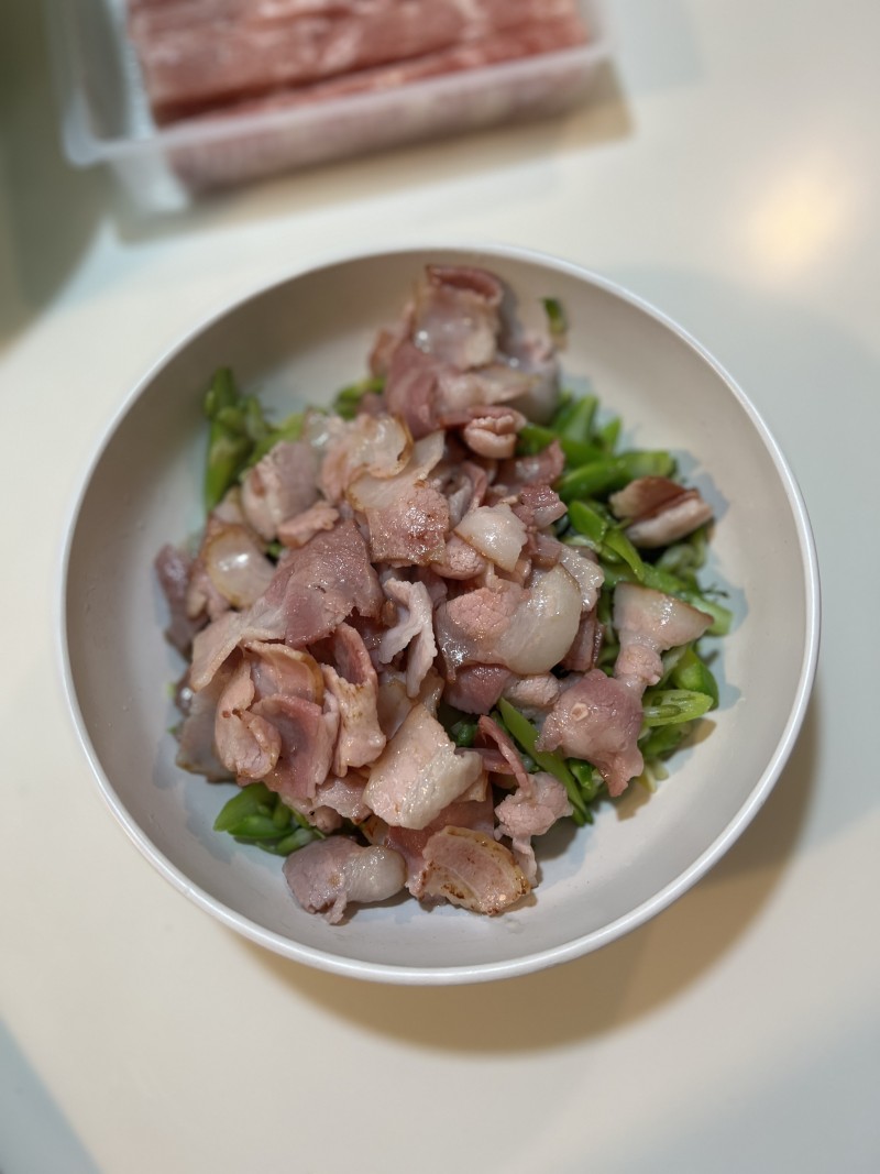 3:培根我直接用了一袋,大概5-6片的样子。切小段。