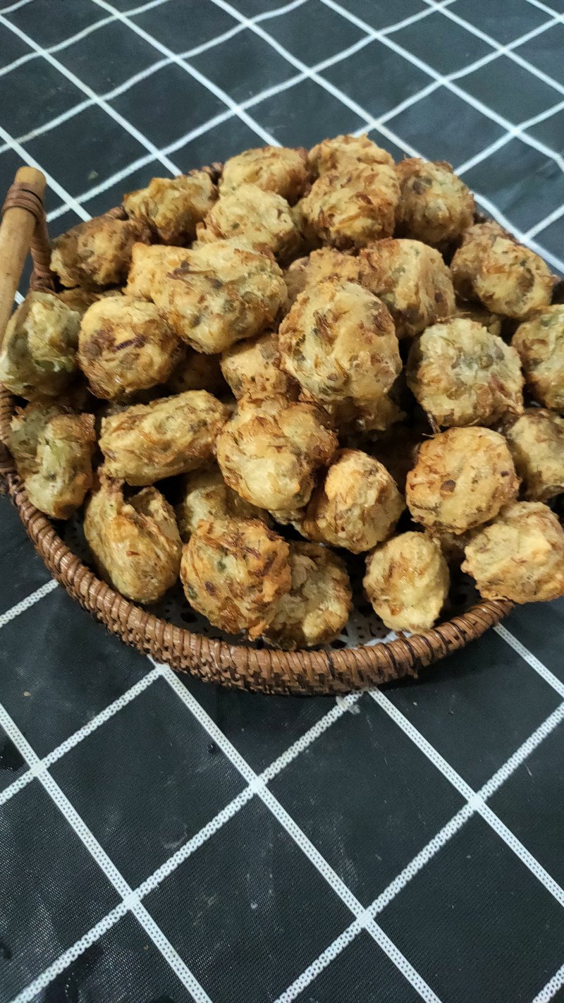 3:锅中倒油,油热就可以炸啦。(把拌好的槐花握在手里一个一个的挤出丸子来。)