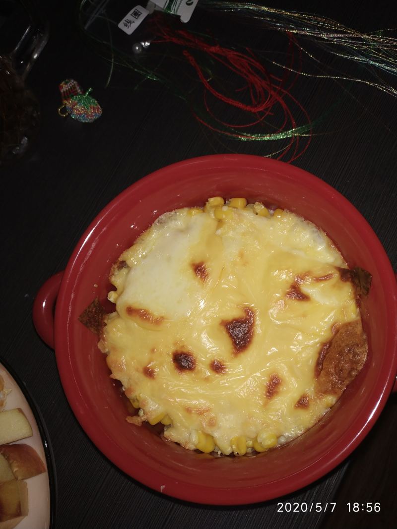 3:玉米上面放芝士碎(家里芝士碎不够了,我放了两片芝士片)。