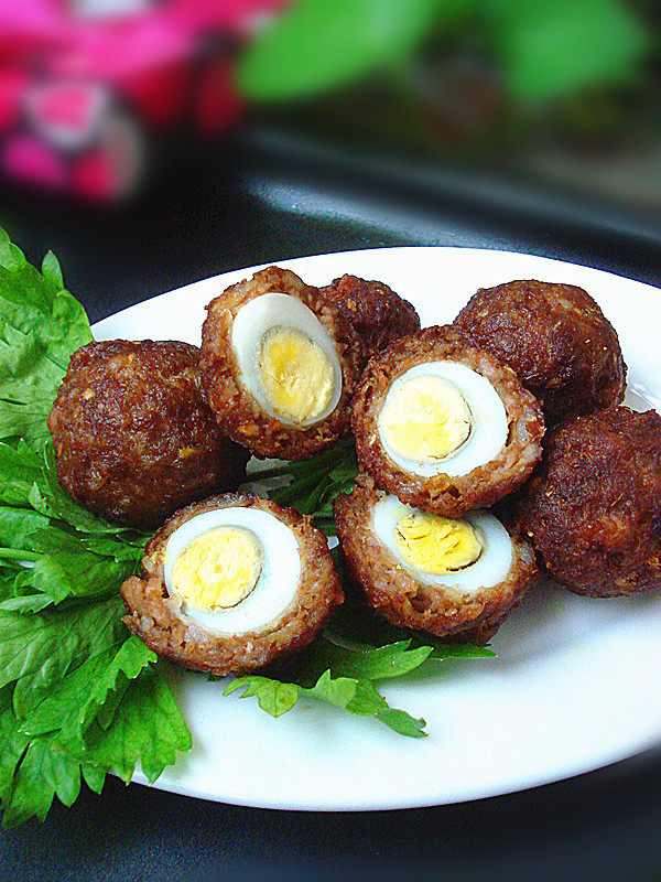 猪肉末里的老抽不要加太多,一点点就行,否则颜色会非常黑,卖相不好。包鹌鹑蛋之前一定要裹些面粉,切开以后鹌鹑蛋就不会和外面的脆壳分离啦。
