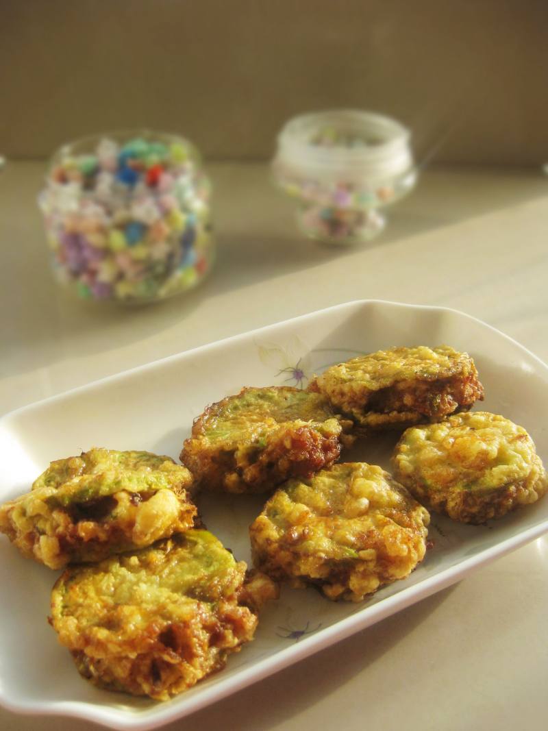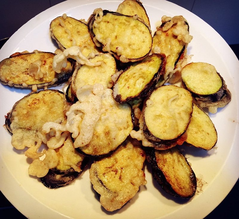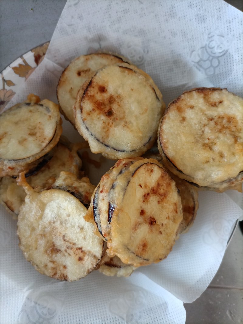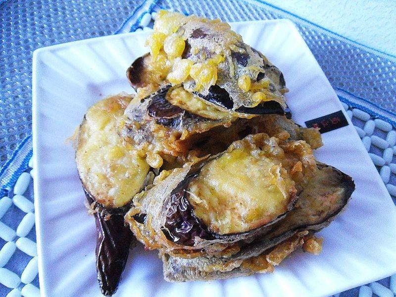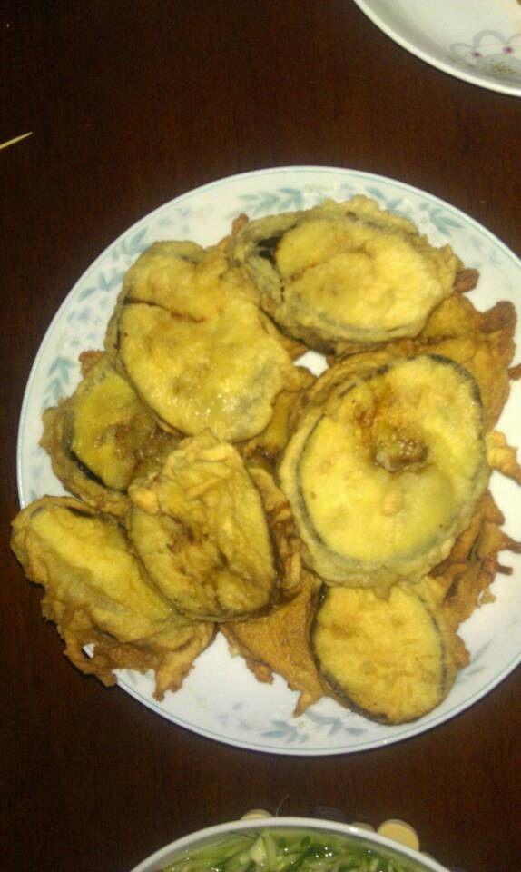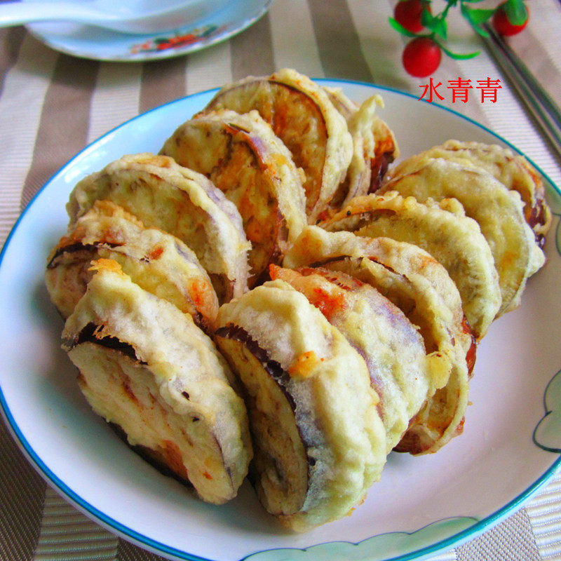 8:夹了肉的茄子裹上面糊进油锅炸,看起来不错吧!要趁热吃还是脆的呢