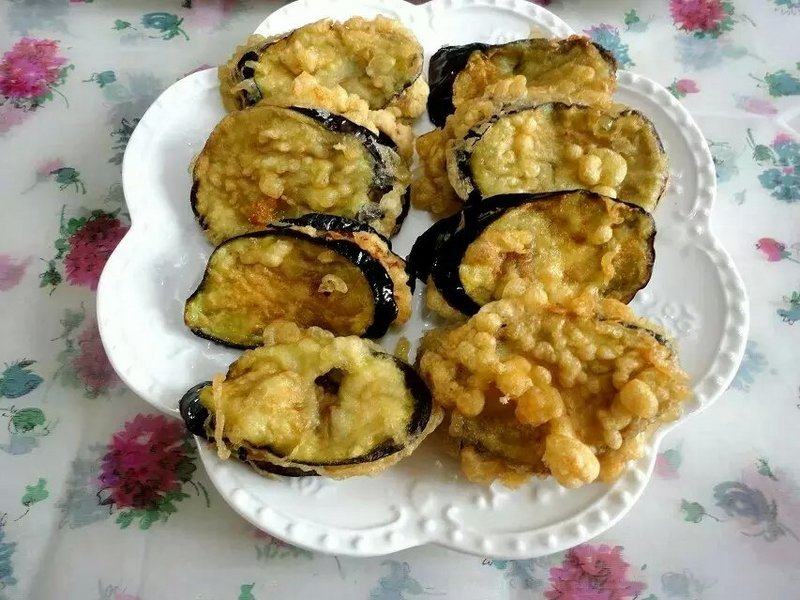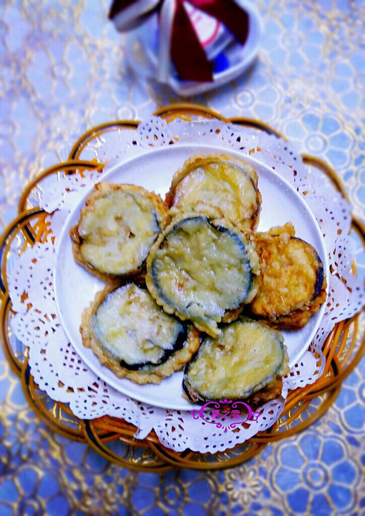 6:油放入锅中,6-7分熟,茄子挂面糊,放入油锅中,炸至金黄色,取出,装盘即可