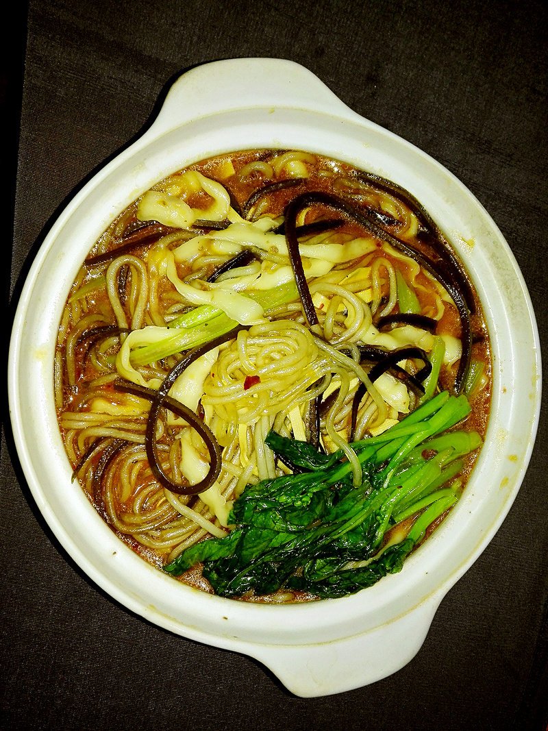 土豆粉适量;刀削面适量;菜心几棵;豆皮一张;海带丝若干;