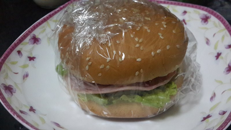 3:盖上汉堡片,用保鲜膜包好,可以当明天的早餐!
