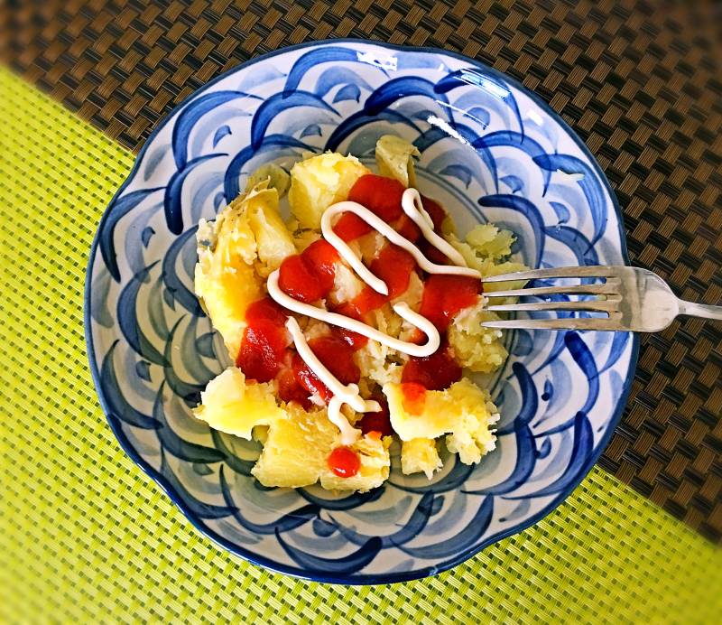 3:取出红薯,剪开纸巾、取红薯蘸炼乳食用。