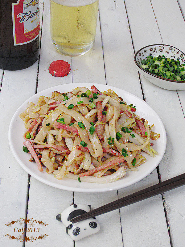 河粉500克;娃娃菜1个;火腿1块;猪肉200克;