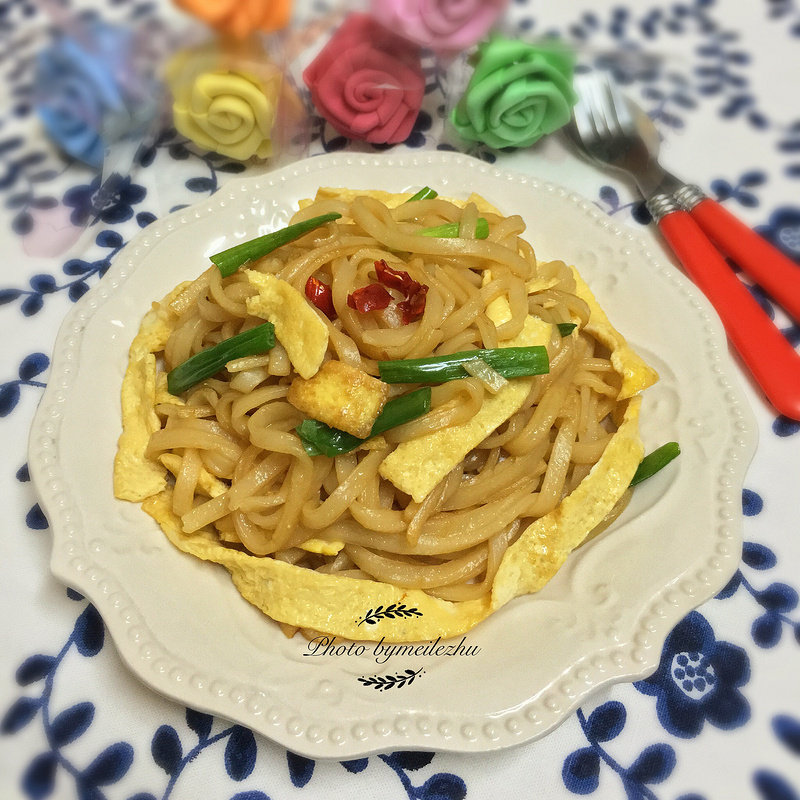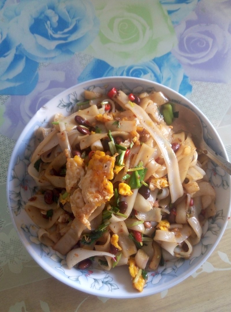 3:倒入河粉,放葱段。加少许盐,鸡精,生抽后翻炒一分钟装盘。一碗香喷喷的鸡蛋炒河粉就大功告成!可以开吃啦!