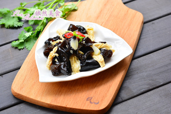 1:.材料:小黑木耳300克腐竹100克红辣椒2个大蒜3瓣调料:酸醋适量调和油适量盐适量味精适量