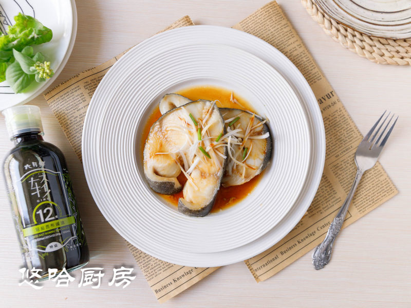 5:到时间后取出鱼盘,倒掉盘中的汤汁、去掉葱姜,放葱白丝,浇上2勺轻盐昆布酱油,即可开吃。