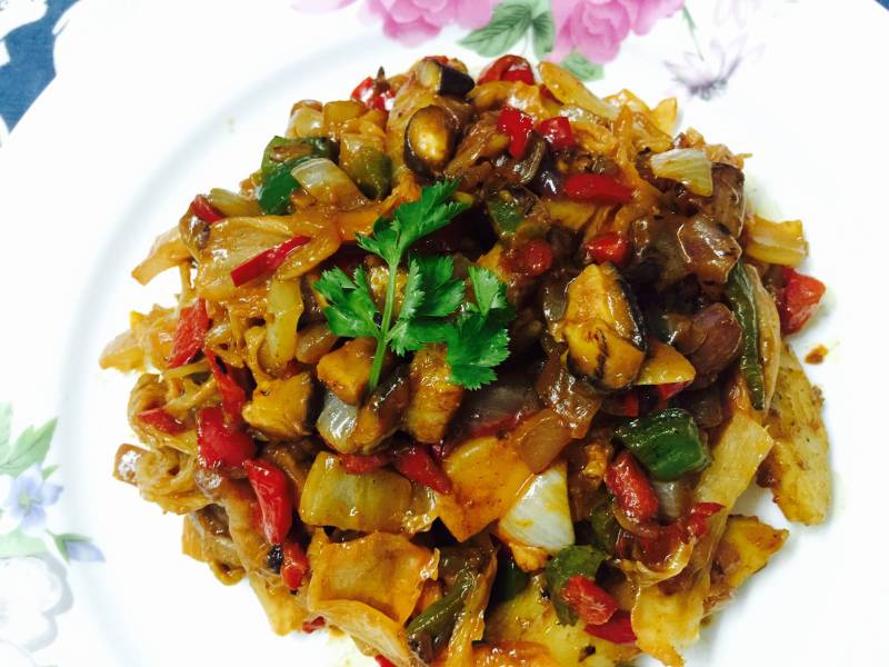 3:热油下洋葱炒变色,加青红椒炒;