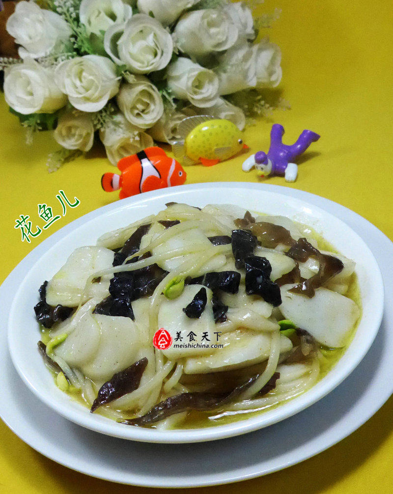 2:将已清洗好的黑木耳放在案板上切开,待用。