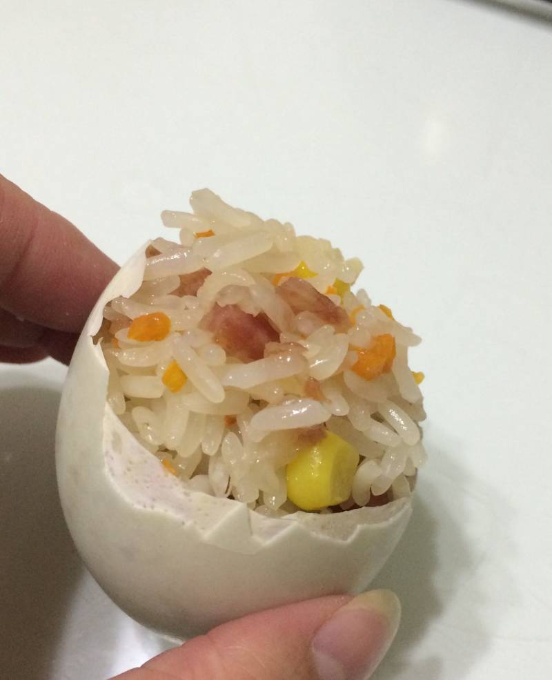 5:把混合好的糯米装进取好蛋白的蛋壳里面,边装边用筷子把糯米压紧
