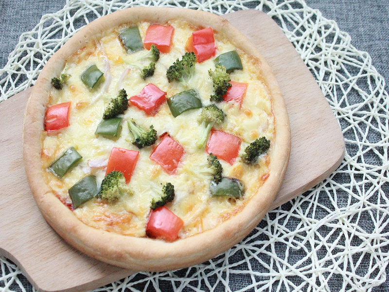 番茄酱适量;洋葱适量;西兰花适量;青圆椒适量;红圆椒适量;马苏里拉芝士适量;
