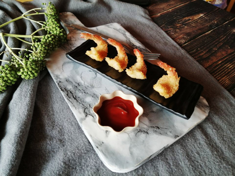 7:放在吸油纸上,吸去多余的油。可蘸番茄沙司或椒盐粉食用,也可把椒盐粉撒在黄金凤尾虾上食用。