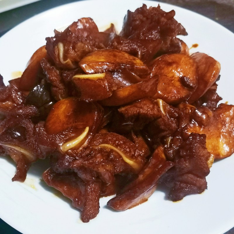 7:倒入煮了半小时左右的猪脆骨,加生抽和老抽继续焖烧一刻钟左右。
