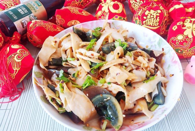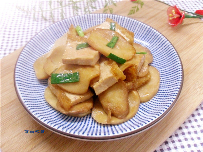 杏鲍菇先煸炒软再加入猪皮,猪皮本身熟的,炒均匀热透就可以了。葱段梗部和叶子分开两次放入。可以增香提色。