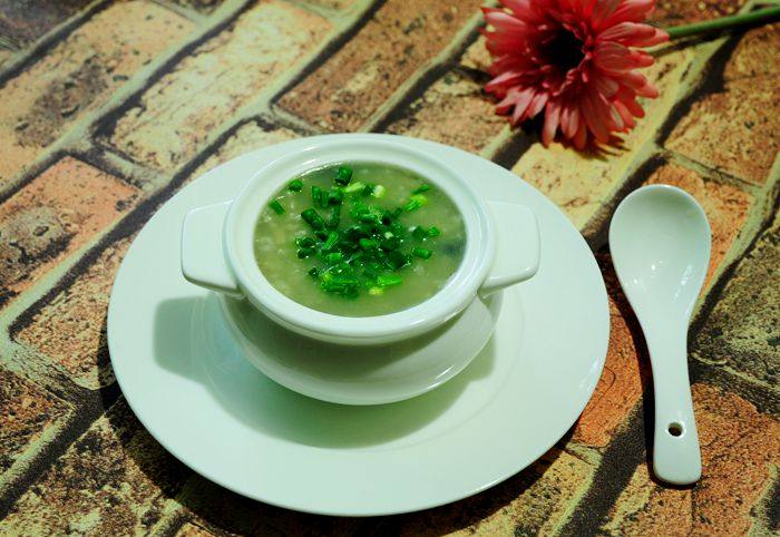 5:砂锅中放入半碗粳米,加半锅水大火煮开,捞出浮沫,然后加入皮蛋和鲍菇煮沸,小火慢煮一个小时。用砂锅煮出来的粥是非常香的。盛入碗中撒上香葱即可。