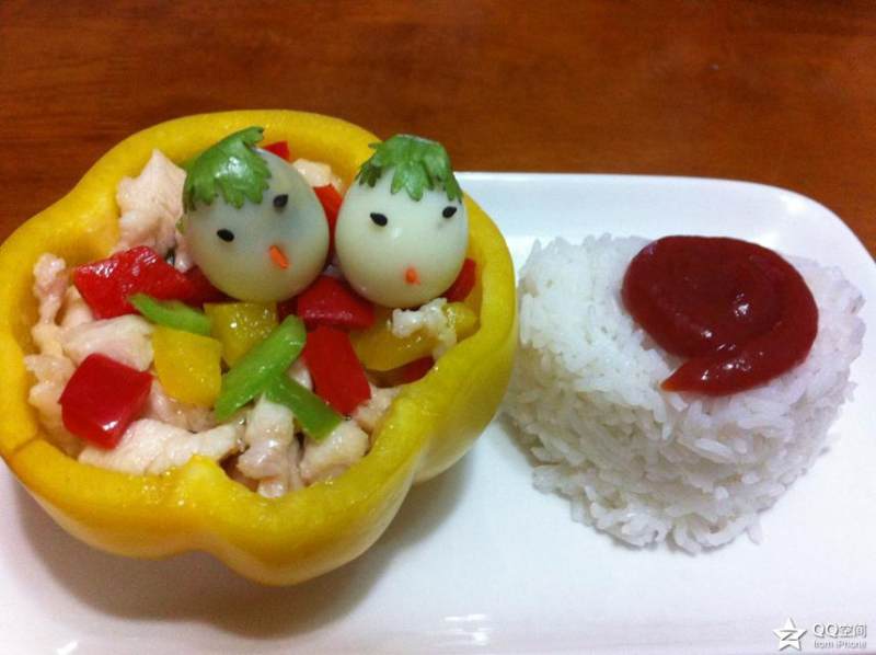 4:锅放油烧开现钞鸡胸脯,炒白之后放黄红椒翻炒,然后放进黄椒里面,把做好的鹌鹑蛋放进去,米饭做个造型,加点番茄汁,就可食用了。