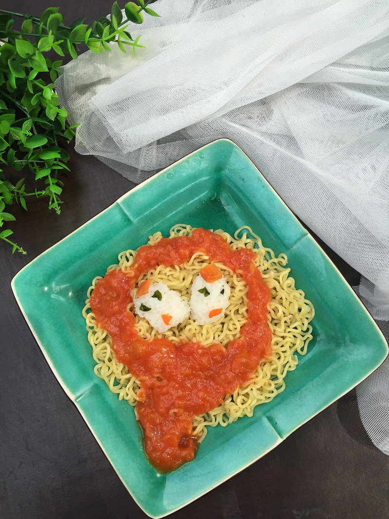 6:面汤中的海带做成眼睛,胡萝卜做成嘴巴和头冠