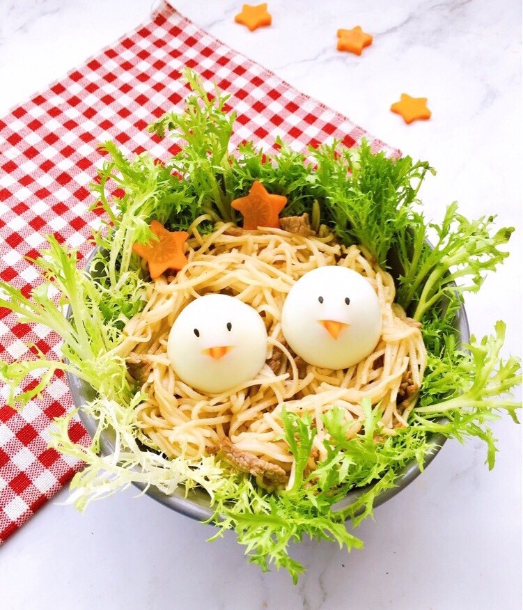 6:鸡蛋蛋白作为小鸟眼白部分。,海苔剪成圆形作为眼睛。