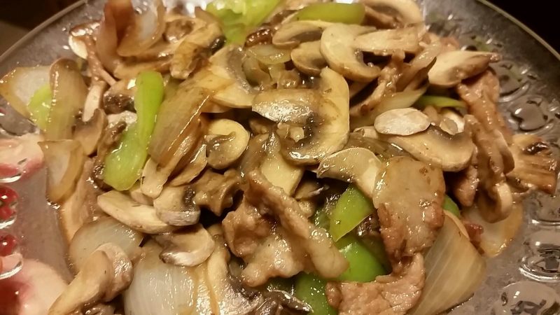 4:起锅烧油,把腌好的肉片滑一下盛出,用锅里的底油,把葱姜炒出香味,下口蘑翻炒,下肉片,放少许料酒,和生抽,加少许的盐,白糖翻炒三分钟出锅了。