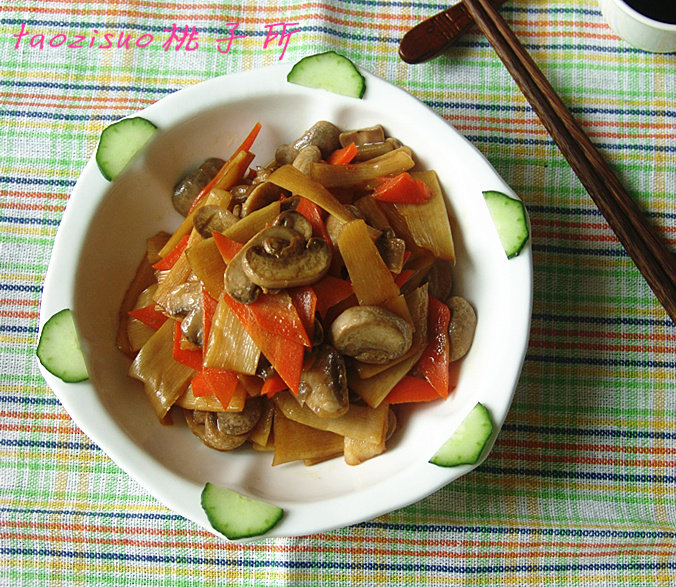 口蘑5朵;胡萝卜半根;食盐2克;生抽1小勺;姜片4片;