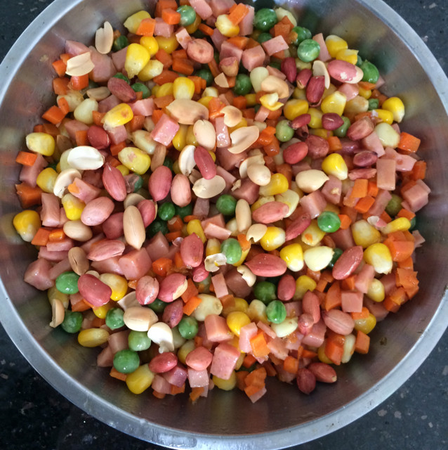 豌豆30克;火腿30克;玉米30克;胡萝卜30克;花生米1克;
