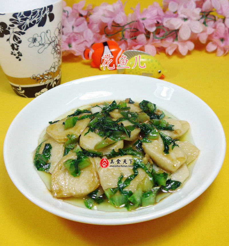5:接着,合入切好的油麦菜和焯好的年糕翻炒翻炒。
