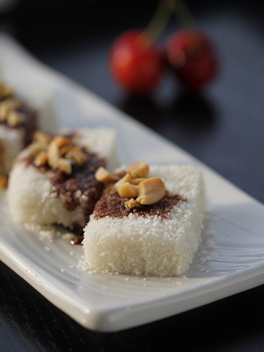 9:将粘好椰蓉的年糕摆放在盘上,在表面浇淋上巧克力酱;