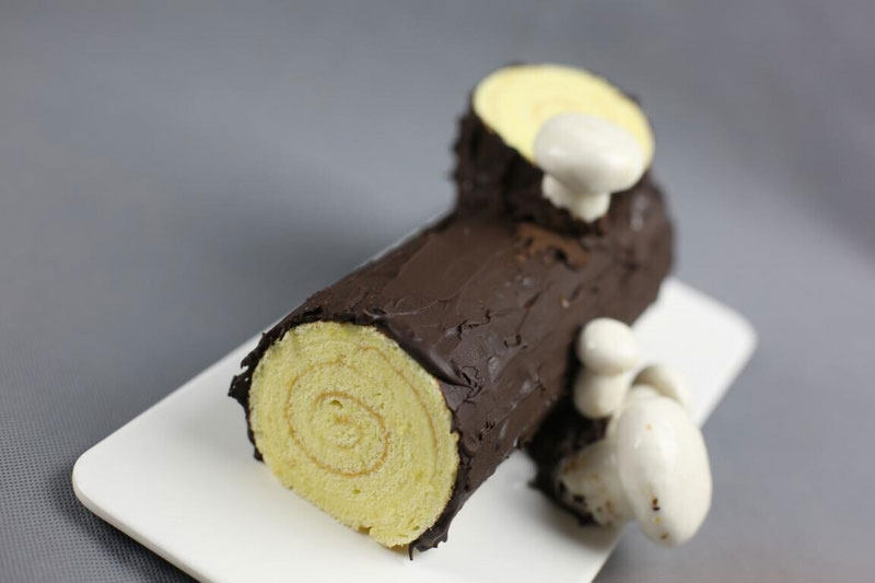 11:在卷好的蛋糕卷一端切下一段做树干分枝,整个蛋糕体表面抹上已备好的软质巧克力酱,用抹刀不规则的抹出树皮,再用翻糖膏做几朵蘑菇用来做装饰即可