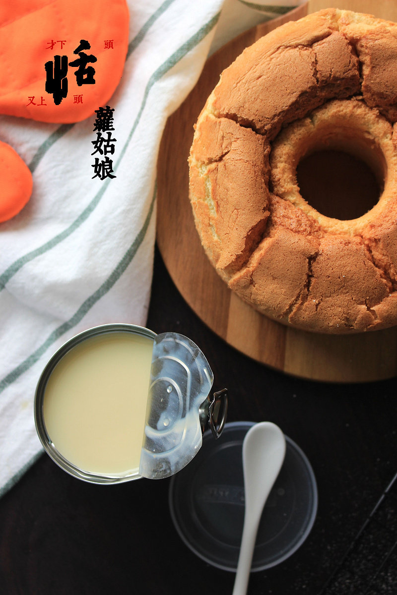 9:烤好取出后迅速倒扣,撕去油纸。涂上一层炼乳。