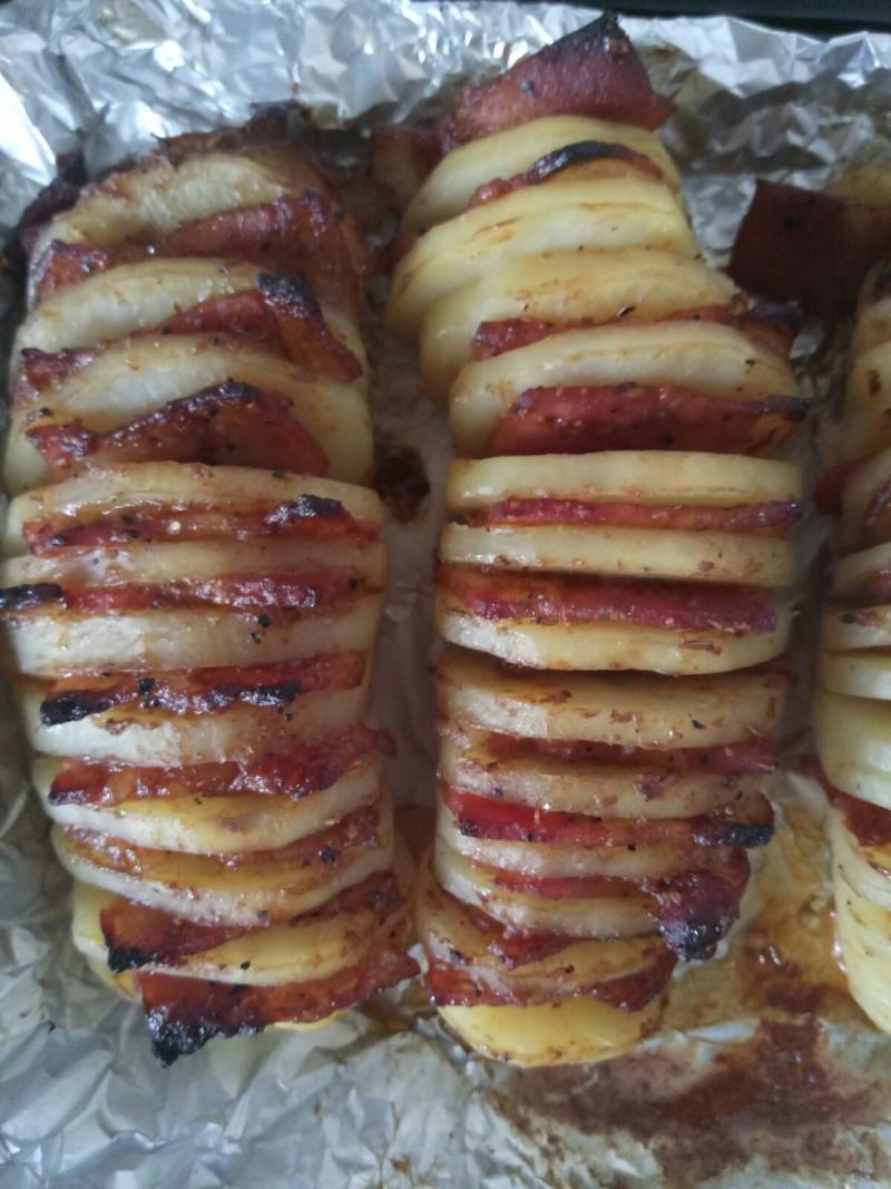 2:蒸土豆的时间就把培根切小片,大小看土豆大小吧,土豆小就切小片就可以了,用烧烤酱,耗油,黑椒酱,辣椒粉把培根片腌一会,基本按自己的喜好调味就可以了
