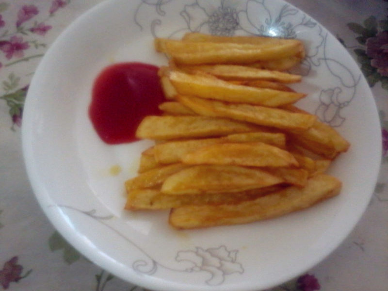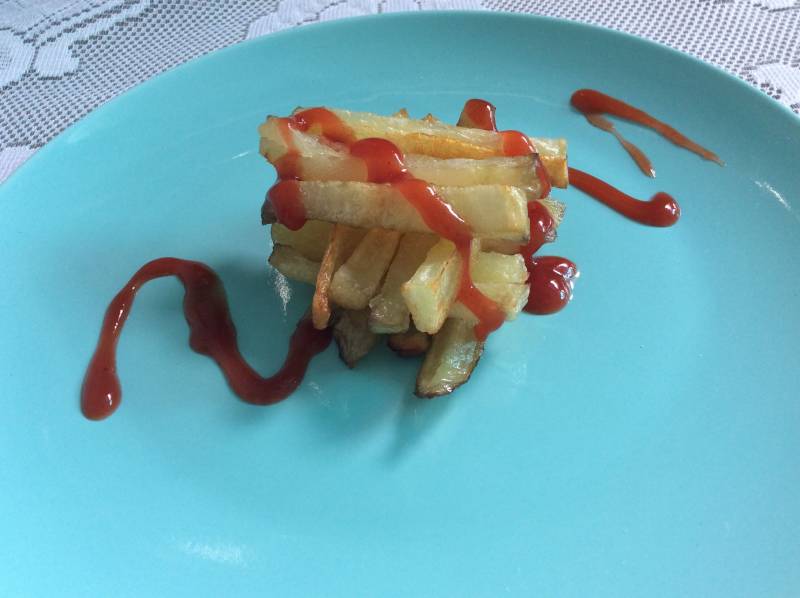 4:烤盘上铺锡纸,把土豆条均匀铺上去,再刷一点油。190度20分钟左右,具体的根据自己烤箱脾气定哈。烤好后,蘸番茄酱就可以吃啦!