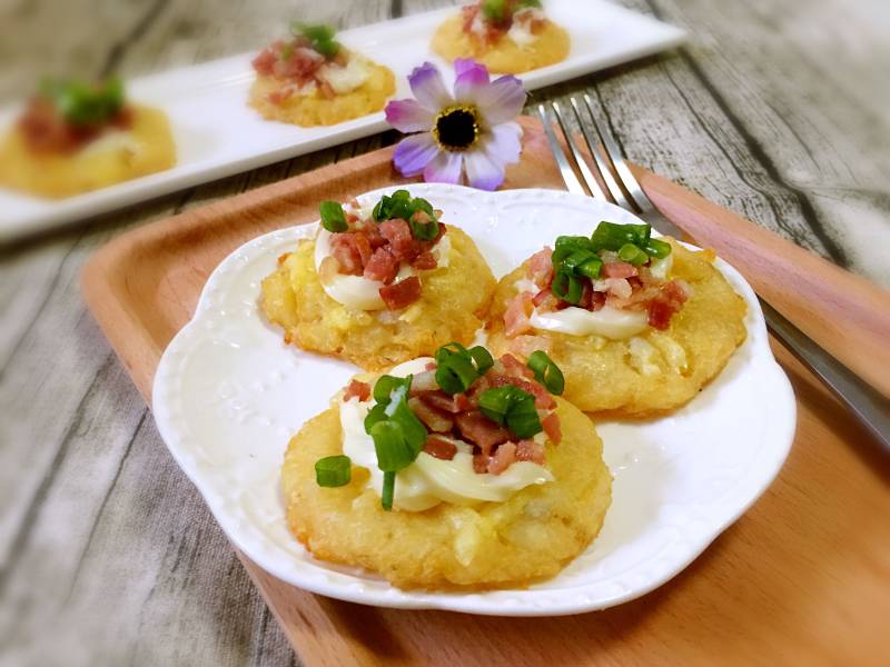 10:挤上沙拉酱,放上培根,撒上葱花,趁热吃...香...