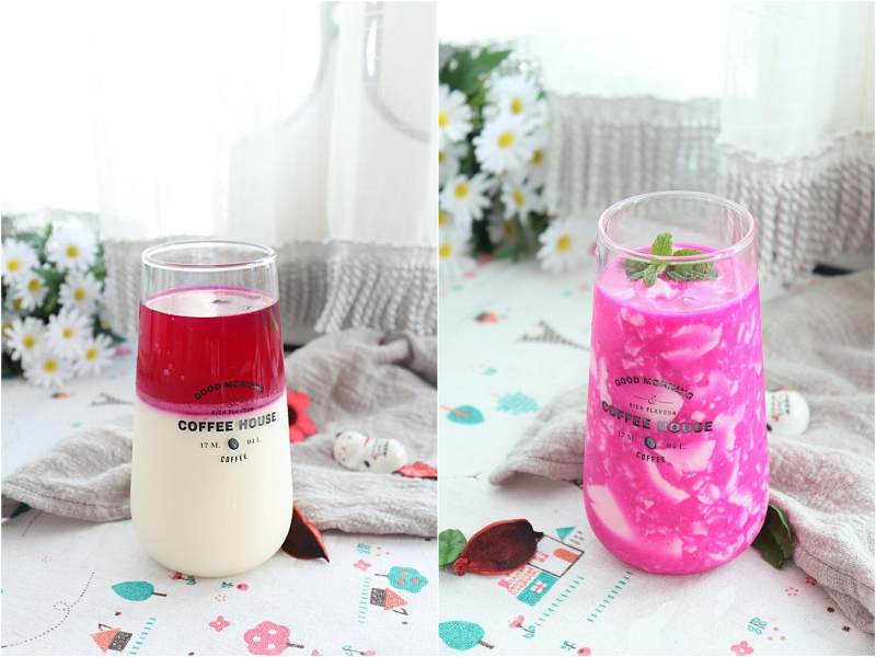 6:取出凝固的奶酪冻,倒入制好的火龙果气泡水,这款火龙果奶酪冻就做好了,喝之前要搅拌几下,非常惊艳的哟!
