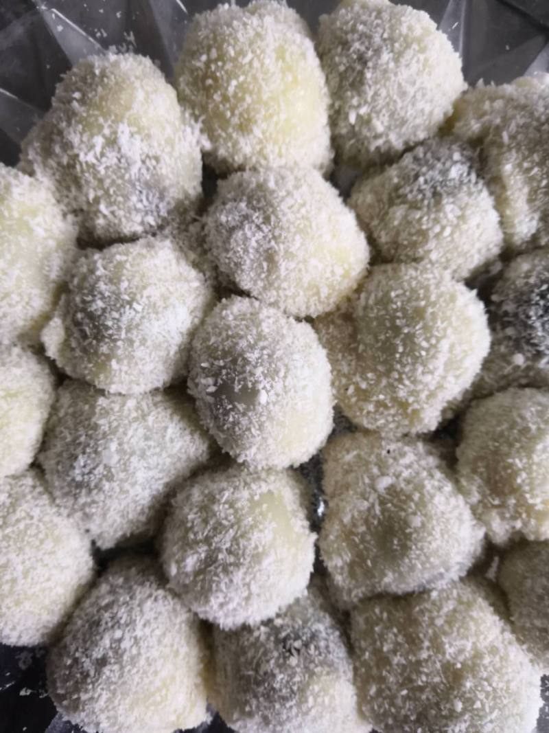 11:把糯米剂子压扁包上红枣花生芝麻球,裹上椰蓉,装盘即可,香味浓郁,口感丰富的即食汤圆就做好了,悠闲的午后来一份,绝对是高颜值的下午茶。