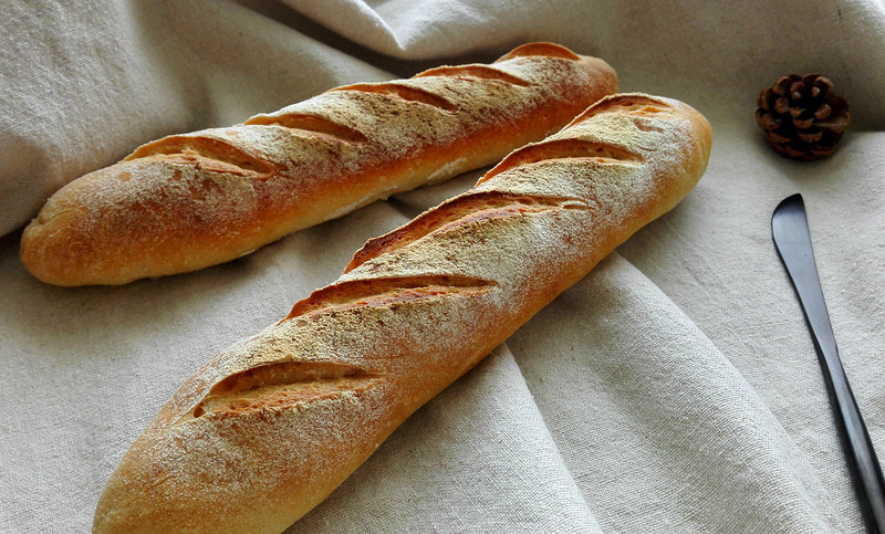 6:预热烤箱到烤箱能达到的最高温度,并在下层放入烤盘及石子以产生蒸汽(没有的可以只在下层放入另一个烤盘,烤盘里放些水)。面团筛上黑麦粉,割包时刀刃侧入割口,在表面割5根15°的斜线。第2个斜线的先端要进入第1个斜线的1/4处。小心的把法棍由帆布移到烤盘上,送进烤箱。向烘焙石泼杯水迅速关门(用烤盘放水的产生蒸汽法,忽略这步)。烤10分钟以后要撤出产生蒸汽的烤盘,否则法棍表皮不脆也不容易烤上色。温度230度继续烤15分钟。(温度和时间仅供参考,因为各烤箱温度不同)。