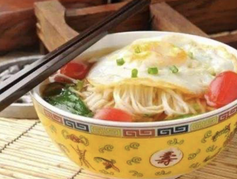 鸡蛋50g;面条300g;肉50g;虾50g;泡好的木耳20g;泡好的黄花菜20g;水800ml;