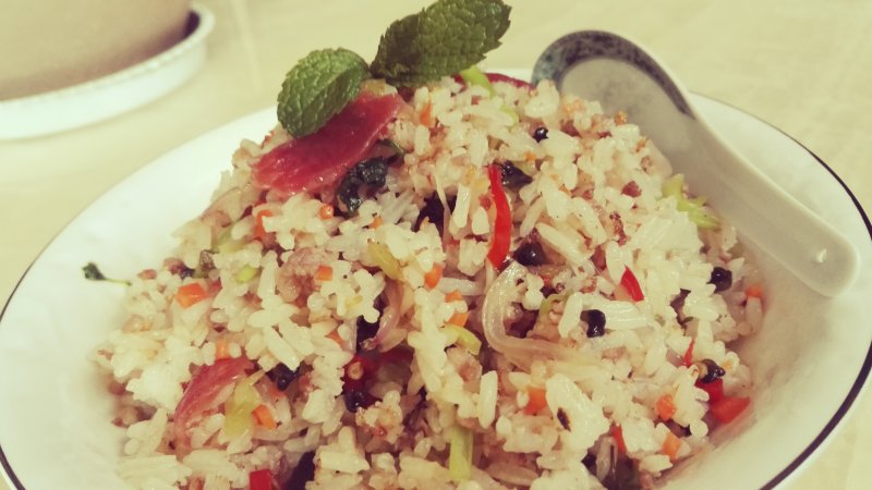 洋葱8g;胡萝卜10g;芹菜10g;甜肠8g;皱皮椒15g;腌韭菜花10g;米饭350g;