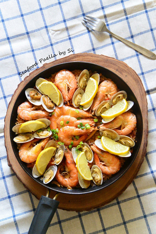 16:在饭上摆上虾和蛤蜊,加盖转小火,煮至米饭软烂汤汁收干。摆上柠檬片即可。