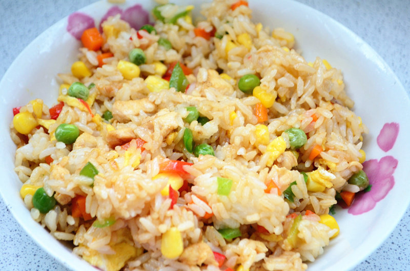 6:起锅倒油,先煎蛋,捣碎盛出;然后重新加油,油微热后超鸡丁,待鸡丁表面变色后倒入少许生抽,后倒入青椒红椒和胡萝卜丁翻炒,加入适量盐,再加入之前炒好的鸡蛋碎和豌豆粒玉米粒以及米饭,中小火翻炒均匀即可出锅。