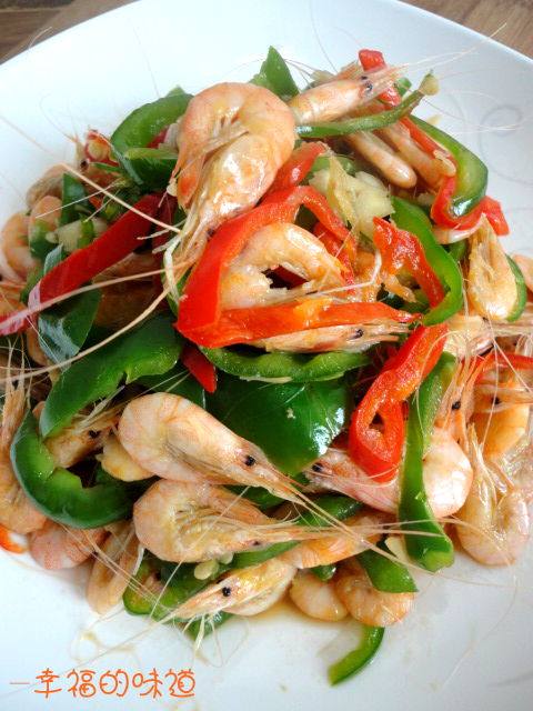 河虾250克;青椒适量;红辣椒适量;蒜蓉适量;料酒适量;盐适量;糖适量;鸡精适量;