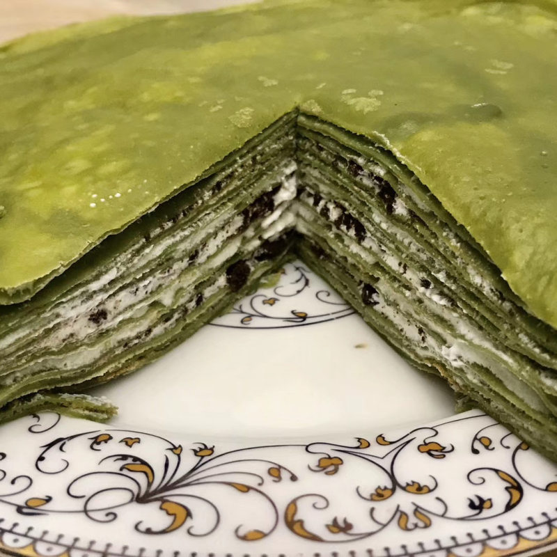 4:平底锅刷一层油,锅热以后倒入一勺抹茶糊,转动平底锅,把抹茶糊铺开,关火,焖几秒钟,再用木勺或软勺把皮揭起,放到一边晾凉备用。