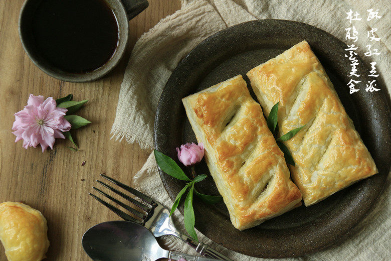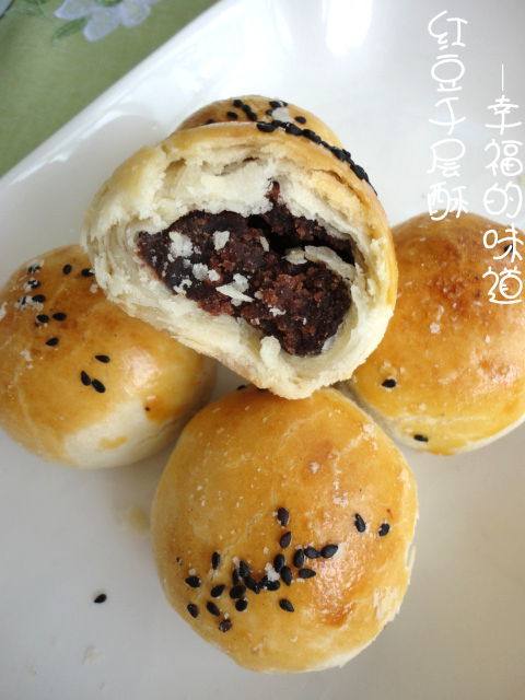 6:一层皮一层奶油,再放上事先煮好的红豆,再用奶油和皮铺盖。