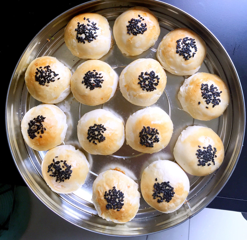 10:排放在铺了油纸或锡纸或抹油的烤盘中。表面刷上蛋黄,再沾上黑芝麻烤箱预热至200℃,烤约20-25分钟至表面呈金黄色即完成。
