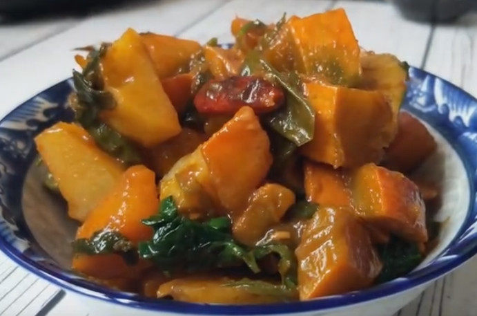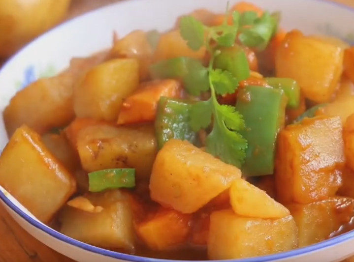 6:土豆,南瓜变软后加入葱叶,香菜翻炒收汁即可,非常软糯香甜。